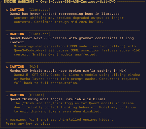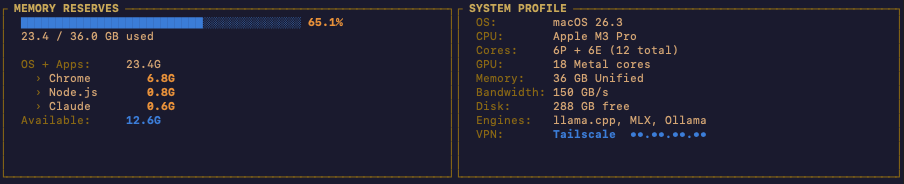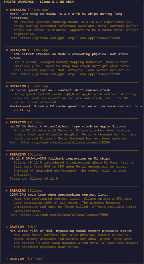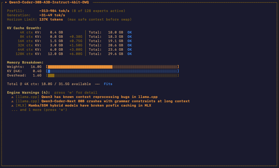 That moment crystallized the problem. When you run local LLMs on Apple Silicon, there is no single tool that tells you: what fits, how much headroom you have, and what is going to break. You are left guessing. How much unified memory does the OS actually need? How does KV cache scale at 32k context vs 128k? What inference engine bugs exist for the model you want to run? Nobody tells you this upfront. You learn it the hard way, one OOM error at a time.