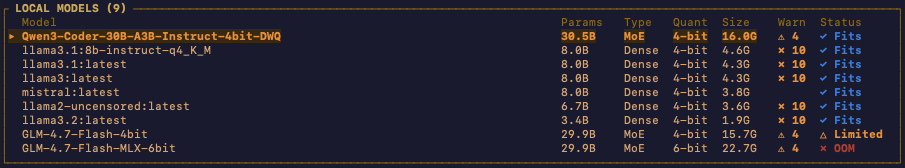Your local models are displayed with the information that actually matters: parameter count, architecture type (MoE vs Dense), quantization format, inference engine warnings, and fit status — how tight the model sits in your available memory. Melange also detects Ollama models automatically, since a large portion of the local AI community uses Ollama as their primary interface.