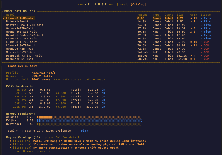 I built Melange because I wanted the tool I did not have when I started running local LLMs. If it saves you from one OOM error or one afternoon debugging an engine bug you did not know about, it did its job.